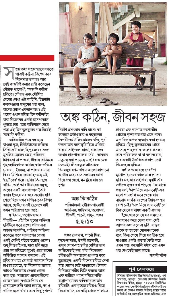 সহজ কথা সহজ ভাবে বলতে পারাই কঠিন। বিশেষ করে সিনেমার ভাষায়। আর সেই কাজটাই করার চেষ্টা করেছেন সৌরভ পালোধী, ‘অঙ্ক কি কঠিন’ ছবিতে। সৌরভ এবং সৌমিত দেবের লেখা এই কাহিনি, চিত্রনাট্য কতকগুলো মানুষের গল্প বলে, যাদের চোখে একরাশ স্বপ্ন। এই গল্পের প্রধান চরিত্র তিন কচিকাঁচা, যারা নিজেদের একটা হাসপাতাল খুলতে চায়। তার অভিযানে নেমে পড়া এই তিন স্কুলছুটের গল্প নিয়েই ‘অঙ্ক কি কঠিন’।