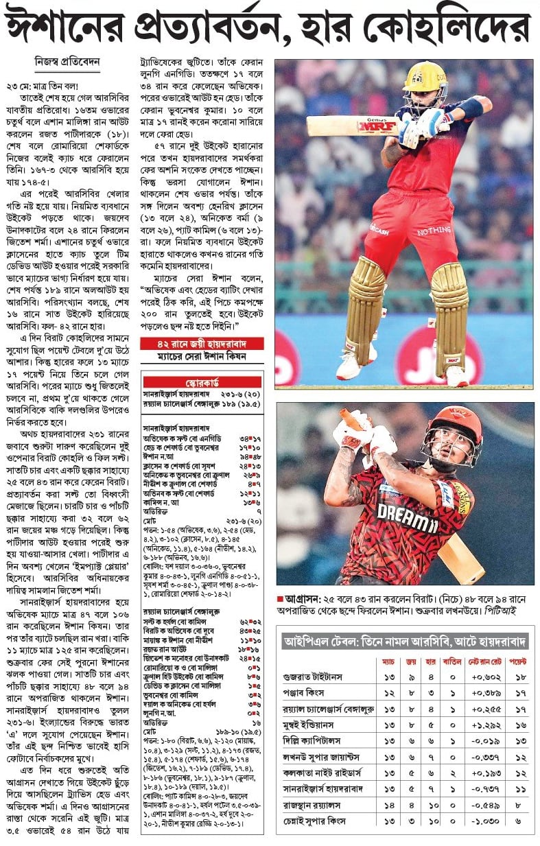 এর পরেই আরসিবির খেলার গতি নষ্ট হয়ে যায়। নিয়মিত ব্যবধানে উইকেট পড়তে থাকে। জয়দেব উনাদকাটের বলে ২৪ রানে ফিরলেন জিতেশ শর্মা। এশানের চতুর্থ ওভারে ক্লাসেনের হাতে ক্যাচ তুলে টিম ডেভিড আউট হওয়ার পরেই সরকারি ভাবে ম্যাচের ভাগ্য নির্ধারণ হয়ে যায়। শেষ পর্যন্ত ১৮৯ রানে অলআউট হয় আরসিবি। পরিসংখ্যান বলছে, শেষ ১৬ রানে সাত উইকেট হারিয়েছে আরসিবি। ফল- ৪২ রানে হার।