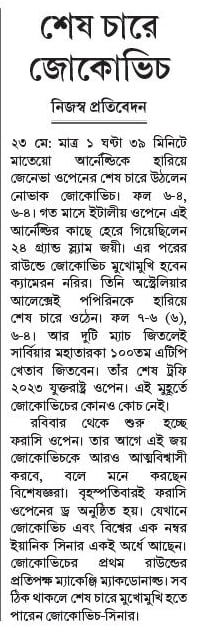 ২৩ মে: মাত্র ১ ঘণ্টা ৩৯ মিনিটে মাতেয়ো আর্নেল্ডিকে হারিয়ে জেনেভা ওপেনের শেষ চারে উঠলেন নোভাক জোকোভিচ। ফল ৬-৪, ৬-৪। গত মাসে ইটালীয় ওপেনে এই আর্নেল্ডির কাছে হেরে গিয়েছিলেন ২৪ গ্র্যান্ড স্ল্যাম জয়ী। এর পরের রাউন্ডে জোকোভিচ মুখোমুখি হবেন ক্যামেরন নরির। তিনি অস্ট্রেলিয়ার আলেক্সেই পপিরিনকে হারিয়ে শেষ চারে ওঠেন। ফল ৭-৬ (৬), ৬-৪। আর দুটি ম্যাচ জিতলেই সার্বিয়ার মহাতারকা ১০০তম এটিপি খেতাব জিতবেন। তাঁর শেষ ট্রফি ২০২৩ যুক্তরাষ্ট্র ওপেন। এই মুহূর্তে জোকোভিচের কোনও কোচ নেই।
