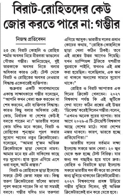 ২৩ মে: বিরাট কোহলি ও রোহিত শর্মার অবসর নিয়ে নীরবতা ভাঙলেন গৌতম গম্ভীর। জানিয়েছেন, দুই তারকাকে অবসর নিতে বলার অধিকার কারও নেই। টেস্ট থেকে বিরাট ও রোহিতের অবসর নেওয়ার সিদ্ধান্ত একেবারেই ব্যক্তিগত।