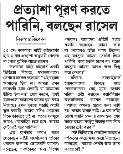 কলকাতা নাইট রাইডার্স একটি ভিডিয়ো দিয়েছে সমাজমাধ্যমে। সেখানে রাসেল বলেছেন, ‘‘এই বছরটা আমাদের ছিল না। আমরা এমন কয়েকটি ম্যাচ হেরেছি যা আমাদের উচিত ছিল না।’’ যোগ করেন, ‘‘সেই ম্যাচগুলো আমাদের রাতের ঘুম কেড়ে নিয়েছে। এখন বুঝতে পারছি কতটা ভুল করেছি। আমরা যদিও পেছনের দিকে তাকাতে চাই না। পরের মরসুমে আরও ধারাবাহিক হতে হবে। আমরা সেটা এই বছর পারিনি।’’
