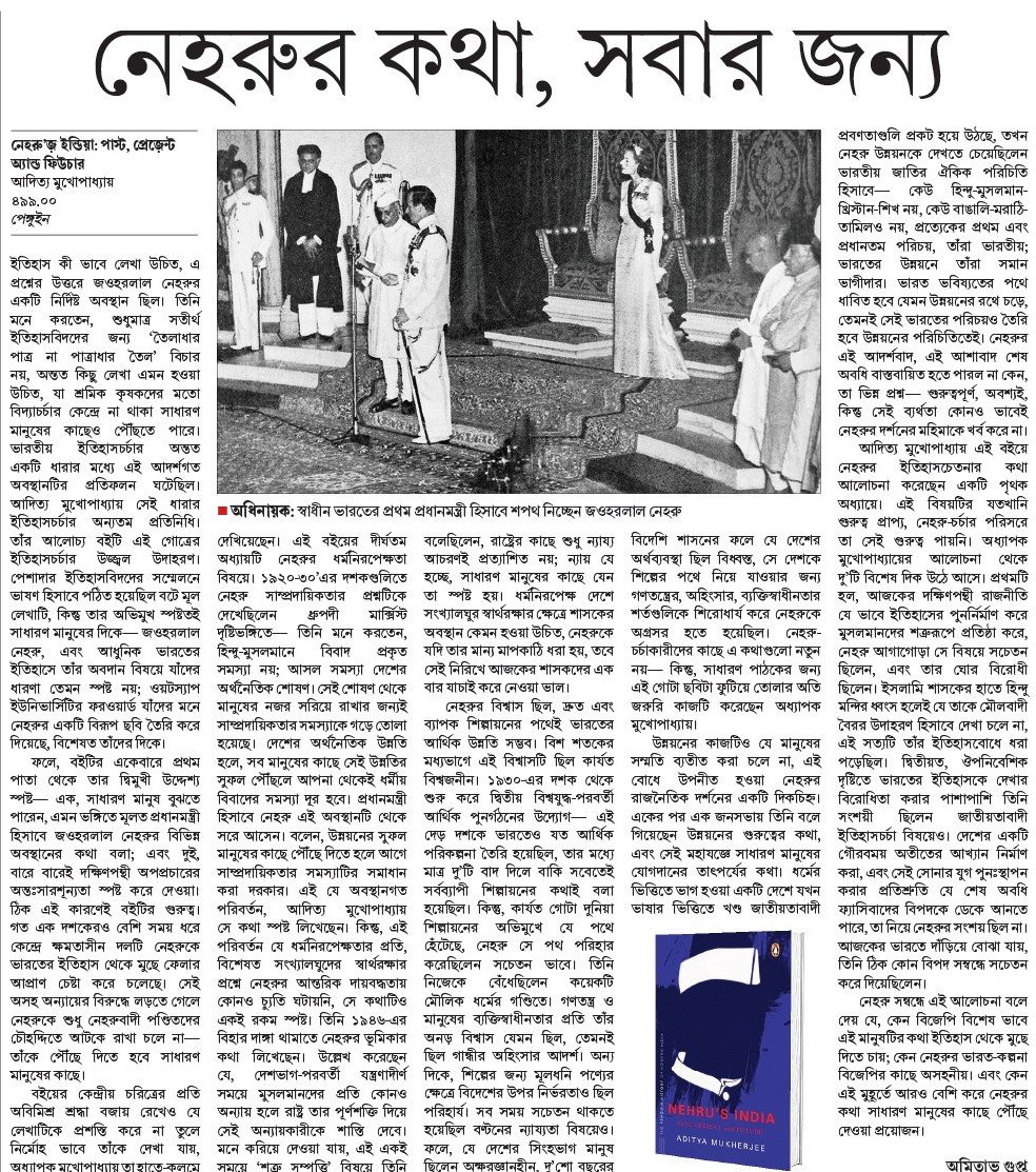 নেহরু সন্বন্ধে এই আলোচনা বলে দেয় যে, কেন বিজেপি বিশেষ ভাবে এই মানুষটির কথা ইতিহাস থেকে মুছে দিতে চায়; কেন নেহরুর ভারত-কল্পনা বিজেপির কাছে অসহনীয়। এবং কেন এই মুহূর্তে আরও বেশি করে নেহরুর কথা সাধারণ মানুষের কাছে পৌঁছে দেওয়া প্রয়োজন।
