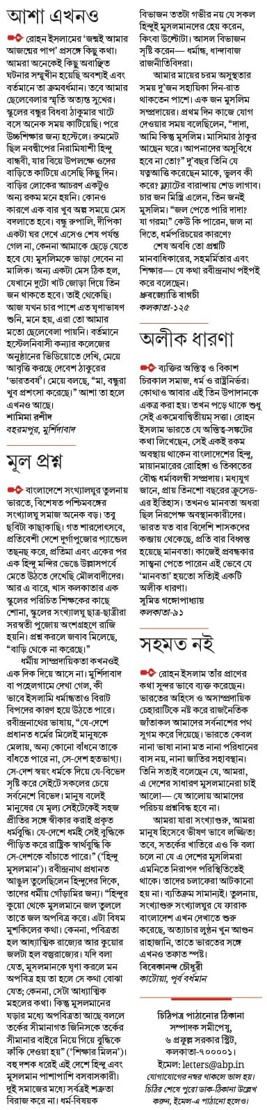 রোহন ইসলাম তাঁর প্রাণের কথা সুন্দর ভাবে ব্যক্ত করেছেন। ভারতের অহিংস ও অসাম্প্রদায়িক চেহারাটিকে নষ্ট করে রাজনৈতিক জাঁতাকল আমাদের সর্বনাশের পথ সুগম করে দিয়েছে। ভারতে কেবল নানা ভাষা নানা মত নানা পরিধানের বাস নয়, নানা জাতির সহাবস্থান। তিনি সত্যই বলেছেন যে, আমরা, এ দেশের সাধারণ মুসলমানেরা চাই আলো— যে আলোয় আমাদের পরিচয় প্রশ্নবিদ্ধ হবে না।