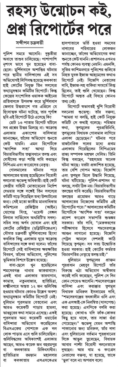 মোট ১৩ পাতার রিপোর্ট ঘাঁটলে সব প্রশ্নের উত্তর মিলছে না। আক্রান্ত এলাকার একাংশের বাসিন্দারা জানাচ্ছেন, তাঁদের অভিযোগ শুনতে কেউ যায়নি। এমন রিপোর্টকে ‘আংশিক সত্য’ আখ্যা দিয়ে বিচারবিভাগীয় তত্ত্বাবধানে তদন্ত এবং দোষীদের কড়া শাস্তি দাবি করছেন সিপিএম এবং কংগ্রেসের নেতৃত্ব।