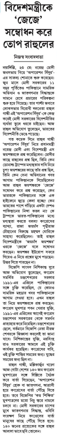 নয়াদিল্লি, ২৩ মে: নরেন্দ্র মোদী জনসভায় গিয়ে ‘অপারেশন সিঁদুর’-এর সাফল্য শোনাতে শুরু করেছেন। জুন মাসে মোদী সরকারের ১১ বছর পূর্তিতেও পাকিস্তানে সামরিক অভিযান ও জাতগণনার সিদ্ধান্তকে সামনে রেখে প্রচারের পরিকল্পনা শুরু হয়ে গিয়েছে। তার পাল্টা জবাবে লোকসভার বিরোধী দলনেতা রাহুল গান্ধী এই ‘অপারেশন সিঁদুর’-কে কেন্দ্র করেই মোদী সরকারের বিদেশনীতির ব্যর্থতা তুলে ধরতে চাইছেন। আজ রাহুল অভিযোগ তুলেছেন, ভারতের বিদেশনীতি ভেঙে পড়েছে।