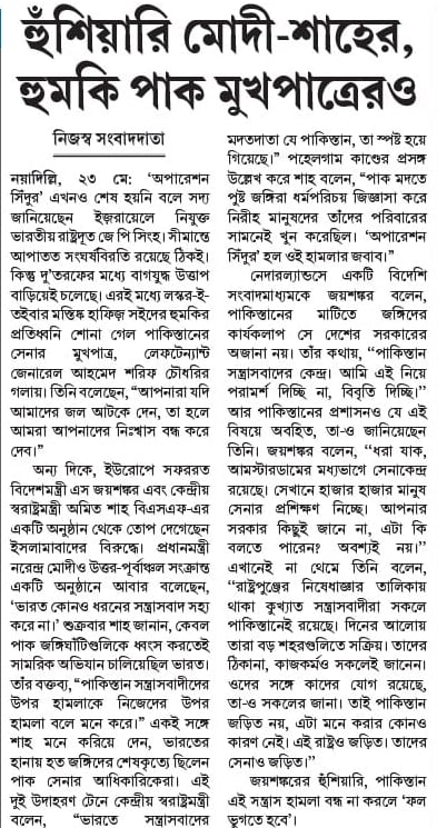 অন্য দিকে, ইউরোপে সফররত বিদেশমন্ত্রী এস জয়শঙ্কর এবং কেন্দ্রীয় স্বরাষ্ট্রমন্ত্রী অমিত শাহ বিএসএফ-এর একটি অনুষ্ঠান থেকে তোপ দেগেছেন ইসলামাবাদের বিরুদ্ধে। প্রধানমন্ত্রী নরেন্দ্র মোদীও উত্তর-পূর্বাঞ্চল সংক্রান্ত একটি অনুষ্ঠানে আবার বলেছেন, ‘ভারত কোনও ধরনের সন্ত্রাসবাদ সহ্য করে না।’ শুক্রবার শাহ জানান, কেবল পাক জঙ্গিঘাঁটিগুলিকে ধ্বংস করতেই সামরিক অভিযান চালিয়েছিল ভারত। তাঁর বক্তব্য, “পাকিস্তান সন্ত্রাসবাদীদের উপর হামলাকে নিজেদের উপর হামলা বলে মনে করে।” একই সঙ্গে শাহ মনে করিয়ে দেন, ভারতের হানায় হত জঙ্গিদের শেষকৃত্যে ছিলেন পাক সেনার আধিকারিকেরা। এই দুই উদাহরণ টেনে কেন্দ্রীয় স্বরাষ্ট্রমন্ত্রী বলেন, “ভারতে সন্ত্রাসবাদের মদতদাতা যে পাকিস্তান, তা স্পষ্ট হয়ে গিয়েছে।” পহেলগাম কাণ্ডের প্রসঙ্গ উল্লেখ করে শাহ বলেন, “পাক মদতে পুষ্ট জঙ্গিরা ধর্মপরিচয় জিজ্ঞাসা করে নিরীহ মানুষদের তাঁদের পরিবারের সামনেই খুন করেছিল। ‘অপারেশন সিঁদুর’ হল ওই হামলার জবাব।”