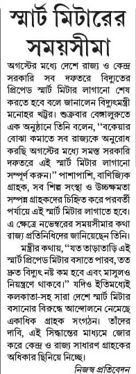 মন্ত্রীর কথায়, ‘‘যত তাড়াতাড়ি এই স্মার্ট প্রিপেড মিটার বসাতে পারব, তত দ্রুত বিদ্যুৎ নষ্ট কম হবে এবং মাসুলও নিয়ন্ত্রণে থাকবে।’’ যদিও ইতিমধ্যেই কলকাতা-সহ সারা দেশে স্মার্ট মিটার বসানোর বিরুদ্ধে আন্দোলনে নেমেছে একাধিক গ্রাহক সংগঠন। তাঁদের দাবি, এই সিদ্ধান্তের মাধ্যমে জোর করে কেন্দ্র ও রাজ্য সাধারণ গ্রাহকের অধিকার ছিনিয়ে নিচ্ছে।