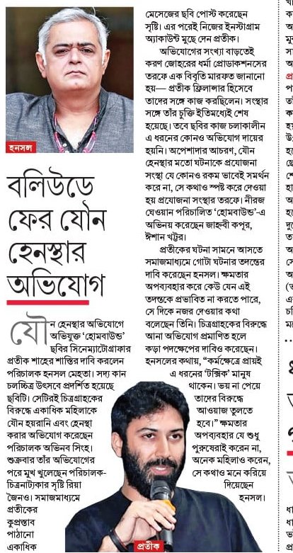 যৌন হেনস্থার অভিযোগে অভিযুক্ত ‘হোমবাউন্ড’ ছবির সিনেম্যাটোগ্রাফার প্রতীক শাহের শাস্তির দাবি করলেন পরিচালক হনসল মেহতা। সদ্য কান চলচ্চিত্র উৎসবে প্রদর্শিত হয়েছে ছবিটি। সেটিরই চিত্রগ্রাহকের বিরুদ্ধে একাধিক মহিলাকে যৌন হয়রানি এবং হেনস্থা করার অভিযোগ করেছেন পরিচালক অভিনব সিংহ। শুক্রবার তাঁর অভিযোগের পরে মুখ খুলেছেন পরিচালক-চিত্রনাট্যকার সৃষ্টি রিয়া জৈনও। সমাজমাধ্যমে প্রতীকের কুপ্রস্তাব পাঠানো একাধিক মেসেজের ছবি পোস্ট করেছেন সৃষ্টি। এর পরেই নিজের ইনস্টাগ্রাম অ্যাকাউন্ট মুছে দেন প্রতীক।