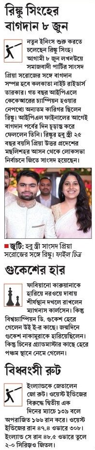 ফাবিয়ানো কারুয়ানাকে হারিয়ে নরওয়ে দাবায় শীর্ষস্থান দখলে রাখলেন ম্যাগনাস কার্লসেন। কিন্তু বিশ্বচ্যাম্পিয়ন ডি. গুকেশ হেরে গেলেন উই ই-র কাছে। জন্মদিনে গুকেশ নাকামুরাকে হারিয়েছিলেন। কিন্তু চিনের গ্র্যান্ডমাস্টার কাছে হেরে পঞ্চম স্থানে নেমে গেলেন।