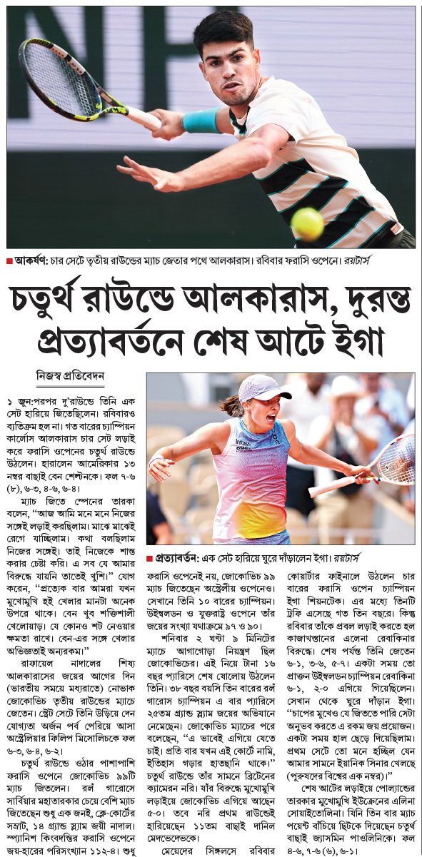 ১ জুন:পরপর দু’রাউন্ডে তিনি এক সেট হারিয়ে জিতেছিলেন। রবিবারও ব্যতিক্রম হল না। গত বারের চ্যাম্পিয়ন কার্লোস আলকারাস চার সেট লড়াই করে ফরাসি ওপেনের চতুর্থ রাউন্ডে উঠলেন। হারালেন আমেরিকার ১৩ নম্বর বাছাই বেন শেল্টনকে। ফল ৭-৬ (৮), ৬-৩, ৪-৬, ৬-৪।