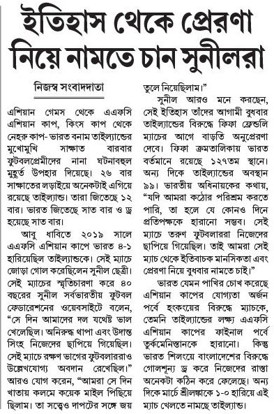 সুনীল আরও মনে করছেন, সেই ইতিহাস তাঁদের আগামী বুধবার তাইল্যান্ডের বিরুদ্ধে ফিফা ফ্রেন্ডলি ম্যাচের আগে বাড়তি অনুপ্রেরণা দেবে। ফিফা ক্রমতালিকায় ভারত বর্তমানে রয়েছে ১২৭তম স্থানে। অন্য দিকে তাইল্যান্ডের অবস্থান ৯৯। ভারতীয় অধিনায়কের কথায়, “যদি আমরা কঠোর পরিশ্রম করতে পারি, তা হলে যে কোনও দিনে প্রতিপক্ষকে হারানো সম্ভব। সেই ম্যাচে তরুণ ফুটবলাররা নিজেদের ছাপিয়ে গিয়েছিল। তাই আমরা সেই ম্যাচ থেকে ইতিবাচক মানসিকতা এবং প্রেরণা নিয়ে বুধবার নামতে চাই।”