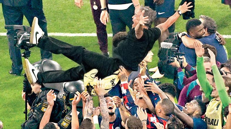 উদ্যাপন: জয়ের পরে এনরিকেকে নিয়ে উচ্ছ্বাস ফুটবলারদের। রয়টার্স