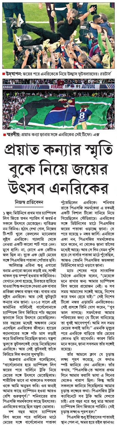 শুক্রবার এনরিকে বলেছিলেন, “বার্সেলোনার হয়ে চ্যাম্পিয়ন্স লিগ জয়ের পরে বার্লিনে ট্রফি নিয়ে মেয়ের সঙ্গে উৎসবে মেতেছিলাম। শারীরিক ভাবে না থাকলেও সবসময় ওকে আমি অনুভব করি। ওর জন্যই আমার কাছে চ্যাম্পিয়ন হওয়া আরও বেশি গুরুত্বপূর্ণ।’’ শনিবারের রাত পিএসজি সমর্থকদের কাছে উৎসবের। এনরিকের কাছে ছিল যন্ত্রণা ভোলার।