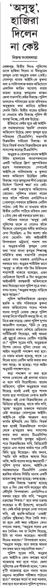 বোলপুর: দ্বিতীয় দিনও পুলিশের ডাকে হাজিরা দিলেন না বীরভূমের তৃণমূল নেতা অনুব্রত মণ্ডল (েকষ্ট)। বোলপুর থানার আইসি-কে কুকথা বলা ও গালিগালাজ করার অভিযোগে একাধিক জামিন অযোগ্য ধারায় মামলা হয়েছে তৃণমূলের প্রাক্তন জেলা সভাপতি কেষ্টর বিরুদ্ধে। পুলিশ ডাকলেও শনিবারের মতো রবিবারও অসুস্থতার কথা জানিয়ে হাজিরা দেননি তিনি। দ্বিতীয় বারেও হাজিরা না দেওয়ায় তাঁর বিরুদ্ধে পুলিশ কী ব্যবস্থা নিচ্ছে, সেই প্রশ্ন উঠেছে।