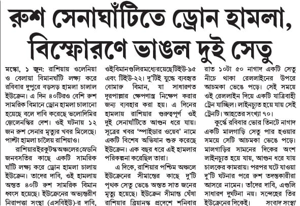 এবং টিইউ-২২। দু’টিই যুদ্ধে ব্যবহৃত বোমারু বিমান, যা সাধারণত দূরপাল্লার ক্ষেপণাস্ত্র নিক্ষেপ করার জন্য ব্যবহার করা হয়। এ দিনের হামলায় রাশিয়ার গুরুত্বপূর্ণ ওই দুই সেনাঘাঁটিতে আগুন ধরে যায়। সূত্রের খবর ‘স্পাইডার ওয়েব’ নামে একটি বিশেষ অভিযান শুরু করেছে ইউক্রেন। এক বছর ধরে এই হামলার পরিকল্পনা করেছিল তারা।