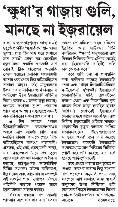 এ দিন সকালে ‘গাজ়া হিউম্যানিটেরিয়ান ফাউন্ডেশন’এর তরফে ত্রাণ সামগ্রী বিলি করা চলছিল রাফায়। জানতে পেরে ভিড় জমিয়েছিলেন অসংখ্য গাজ়াবাসী। প্রসঙ্গত, এই সেই স্বেচ্ছাসেবী সংস্থা, যার নিরপেক্ষতা নিয়ে প্রশ্ন তুলে এদের সঙ্গে ত্রাণকার্য চালাতে অস্বীকার করেছে রাষ্ট্রপুঞ্জ-সহ আন্তর্জাতিক বিভিন্ন সংগঠন। তাঁদের অভিযোগ, ইজ়রায়েল এবং আমেরিকার মদতপুষ্ট এই সংগঠন গাজ়া ভূখণ্ডের ভিতরে গতিবিধি বাড়াতে পরোক্ষ ভাবে ইজ়রায়েলকে সাহায্য করছে।