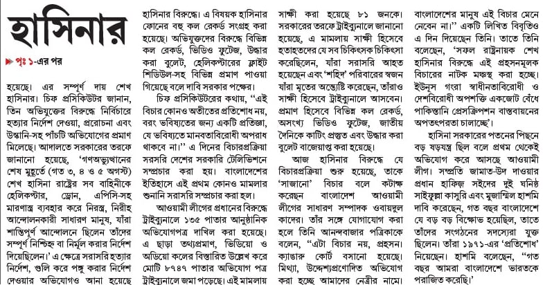 আজ হাসিনার বিরুদ্ধে যে বিচারপ্রক্রিয়া শুরু হয়েছে, তাকে ‘সাজানো’ বিচার বলে কটাক্ষ করেছন বাংলাদেশ আওয়ামী লীগের সাধারণ সম্পাদক ওবায়দুল কাদের। তাঁর সঙ্গে যোগাযোগ করা হলে তিনি আনন্দবাজার পত্রিকাকে বলেন, ‘‘এটা বিচার নয়, প্রহসন। ক্যাঙারু কোর্ট বসানো হয়েছে। মিথ্যা, উদ্দেশ্যপ্রণোদিত অভিযোগ করা হচ্ছে আমাদের নেত্রীর নামে। বাংলাদেশের মানুষ এই বিচার মেনে নেবেন না।’’ একটি লিখিত বিবৃতিও এ দিন দিয়েছেন তিনি। তাতে তিনি বলেছেন, ‘সফল রাষ্ট্রনায়ক শেখ হাসিনার বিরুদ্ধে এই প্রহসনমূলক বিচারের নাটক মঞ্চস্থ করা হচ্ছে। ইউনূস গংরা স্বাধীনতাবিরোধী ও দেশবিরোধী অপশক্তি একজোট বেঁধে পাকিস্তানি প্রেসক্রিপশন বাস্তবায়নের অপতৎপরতা চালাচ্ছে’।