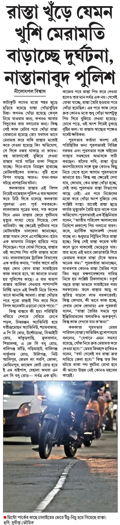 কলকাতা পুরসভার মেয়র পারিষদ (রাস্তা) অভিজিৎ মুখোপাধ্যায় বললেন, ‘‘যেখানে এমন সমস্যা রয়েছে, খোঁজ নিয়ে দ্রুত মেরামত করে দেওয়া হবে।’’ মেয়র ফিরহাদ হাকিমও বলেন, ‘‘বর্ষা গেলেই সব রাস্তা দ্রুত সারিয়ে ফেলা হবে।’’ কিন্তু তত দিন ঘটতে থাকা পথ দুর্ঘটনা রোখা হবে কী ভাবে? উত্তর নেই কোনও মহলের কাছেই।
