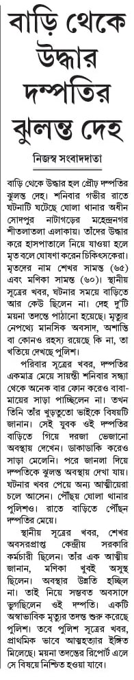 পরিবার সূত্রের খবর, দম্পতির একমাত্র মেয়ে সায়ন্তী শনিবার সন্ধ্যা থেকে অনেক বার ফোন করেও বাবা-মায়ের সাড়া পাচ্ছিলেন না। তখন তিনি তাঁর খুড়তুতো ভাইকে বিষয়টি জানান। সেই যুবক ওই দম্পতির বাড়িতে গিয়ে দরজা ভেজানো অবস্থায় দেখেন। ডাকাডাকি করেও সাড়া মেলেনি। পরে জানলা দিয়ে দম্পতিকে ঝুলন্ত অবস্থায় দেখা যায়। ঘটনার খবর পেয়ে অন্য আত্মীয়েরা চলে আসেন। পৌঁছয় ঘোলা থানার পুলিশও। রাতে বাড়িতে পৌঁছন দম্পতির মেয়ে।