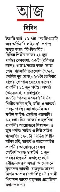 ইমামি আর্ট: ১১-৭টা। ‘দ্য জিওমেট্রি অব অর্ডিনারি লাইভস’। প্রশান্ত সাহুর কাজ। ‘রি-ফিগারিং’। বিভিন্ন শিল্পীর কাজ। ২১ জুন পর্যন্ত। দেবভাষা: ২-৮টা (রবিবার বাদে)। শুভাপ্রসন্নের কাজ। আজ শেষ। গ্যালারি চিত্রলেখা (৭০/২, সেলিমপুর রোড): ২-৮টা (রবিবার বাদে)। গোপাল ঘোষের কাজের প্রদর্শনী। ১৫ জুন পর্যন্ত। অমর্ত্য (উত্তরভাগ, বারুইপুর): ৪-৮টা। ‘পরমা ২০২৫’। বিভিন্ন শিল্পীর আঁকা ছবি, ড্রয়িং ও ভাস্কর্য। ৮ জুন পর্যন্ত। অ্যাকাডেমি অব ফাইন আর্টস: সেন্ট্রাল গ্যালারি। ১২-৮টা। চিত্র, ভাস্কর্য ও হস্তশিল্প প্রদর্শনী। আয়োজনে শিল্পাঙ্গন। ৫ জুন পর্যন্ত। সাউথ ও নিউ সাউথ গ্যালারি। ১২-৮টা। বিভিন্ন শিল্পীর আঁকা ছবি, ভাস্কর্য ও আলোকচিত্র প্রদর্শনী। আয়োজনে বেঙ্গল পেন্টার্স অ্যান্ড স্কাল্পটর্স। ৫ জুন পর্যন্ত। ইন্দুমতী সভাগৃহ: ৪টে। রবীন্দ্র-নজরুল সন্ধ্যা। আয়োজনে সুরনন্দন ভারতী। রামকৃষ্ণ সারদা মিশন আশ্রম (এন্টালি): ৬টা। স্বামী শিবানন্দ স্মারক বক্তৃতায় প্রব্রাজিকা সদানন্দপ্রাণা।