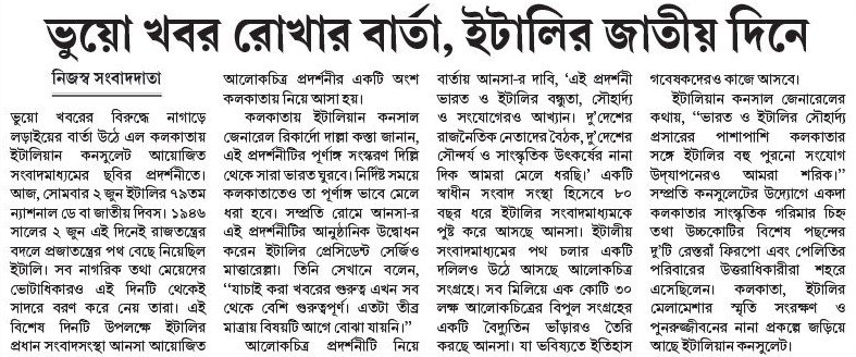 ভুয়ো খবরের বিরুদ্ধে নাগাড়ে লড়াইয়ের বার্তা উঠে এল কলকাতায় ইটালিয়ান কনসুলেট আয়োজিত সংবাদমাধ্যমের ছবির প্রদর্শনীতে। আজ, সোমবার ২ জুন ইটালির ৭৯তম ন্যাশনাল ডে বা জাতীয় দিবস। ১৯৪৬ সালের ২ জুন এই দিনেই রাজতন্ত্রের বদলে প্রজাতন্ত্রের পথ বেছে নিয়েছিল ইটালি। সব নাগরিক তথা মেয়েদের ভোটাধিকারও এই দিনটি থেকেই সাদরে বরণ করে নেয় তারা। এই বিশেষ দিনটি উপলক্ষে ইটালির প্রধান সংবাদসংস্থা আনসা আয়োজিত আলোকচিত্র প্রদর্শনীর একটি অংশ কলকাতায় নিয়ে আসা হয়।