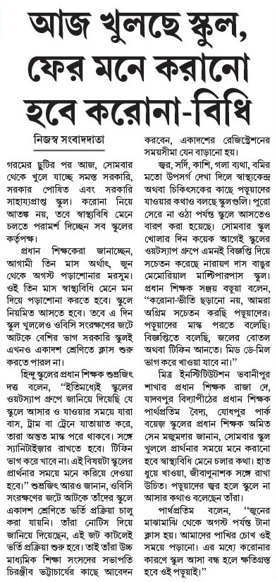 গরমের ছুটির পর আজ, সোমবার থেকে খুলে যাচ্ছে সমস্ত সরকারি, সরকার পোষিত এবং সরকারি সাহায্যপ্রাপ্ত স্কুল। করোনা নিয়ে আতঙ্ক নয়, তবে স্বাস্থ্যবিধি মেনে চলতে পরামর্শ দিচ্ছেন সব স্কুলের কর্তৃপক্ষ।