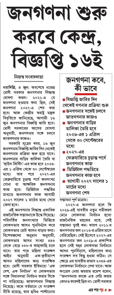 নয়াদিল্লি, ৪ জুন: অবশেষে নরেন্দ্র মোদী সরকার জনগণনার সিদ্ধান্ত ঘোষণা করল। ২০২১-এ যে জনগণনা হওয়ার কথা ছিল, সেই জনগণনা ২০২৭-এ শেষ করা হবে। আজ কেন্দ্রীয় স্বরাষ্ট্র মন্ত্রক বিবৃতিতে জানিয়েছে, আগামী ১৬ জুন জনগণনার বিজ্ঞপ্তি জারি হবে। মোদী সরকারের আগের ঘোষণা অনুযায়ী, জনগণনার সঙ্গে চলবে