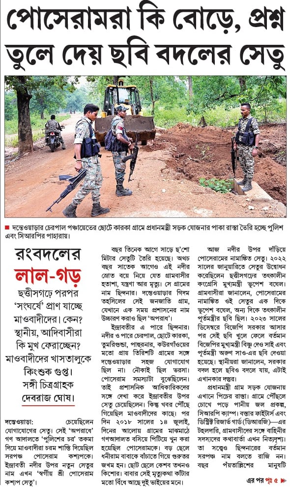 দন্তেওয়াড়া: চেয়েছিলেন যোগাযোগের সেতু। সেই ‘অপরাধে’ গণ আদালতে ‘পুলিশের চর’ তকমা দিয়ে মাওবাদীরা চরম শাস্তি দিয়েছিল সরপঞ্চ পোসেরাম কশ্যপকে। ইন্দ্রাবতী নদীর উপর নতুন সেতুর নাম এখন ‘স্বর্গীয় শ্রী পোসেরাম