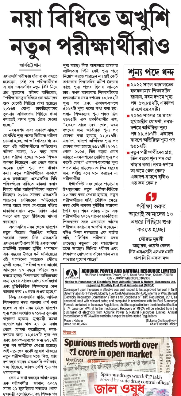 কেন এ কথা বলছেন তাঁরা? নতুন এক পরীক্ষার্থীর জানান, ২০২২ সালে ২১ জুলাইয়ের সভামঞ্চ থেকে মুখ্যমন্ত্রী বলেছিলেন, বহু শিক্ষক পদ শূন্য আছে। কিন্তু আদালতে মামলার জটিলতায় তিনি সেই শূন্য পদে নিয়োগ করতে পারছেন না। হাই কোর্ট তখনকার শিক্ষাসচিব মনীশ জৈনের কাছে শূন্য পদের হিসাব জানতে চায়। তখন আদালতে শিক্ষাসচিবের হলফনামায় নবম-দশমের ১৩,৮৪২টি শূন্য পদ এবং একাদশ-দ্বাদশে ৫৫২৭টি শূন্য পদের কথা বলা হয়। প্রধান শিক্ষকদের শূন্য পদও ছিল ২৩২৫টি। এক চাকরিপ্রার্থীর প্রশ্ন, ‘‘২০২৫ সালে দেখা গেল, নবম দশমের জন্য অতিরিক্ত শূন্য পদ ঘোষণা করা হয়েছে ১১,৫১৭টি। একাদশ, দ্বাদশে অতিরিক্ত শূন্য পদ ঘোষণা করা হয়েছে ৬৯১২টি। ২০২২ থেকে ২০২৫, তিন বছরে কোন জাদুতে নবম-দশমের ঘোষিত শূন্য পদ কমেই গেল?’’ একাদশ-দ্বাদশের শূন্য পদ সামান্য বাড়লেও তা তিন বছরের জন্য পর্যাপ্ত বলে মনে করছেন না পরীক্ষার্থীরা।