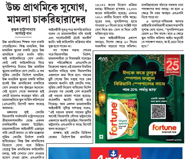 মঙ্গলবার হাই কোর্টের বিচারপতি পার্থসারথি চট্টোপাধ্যায়ের গ্রীষ্মাবকাশকালীন বেঞ্চে একদল চাকরিপ্রার্থীর মামলা উঠেছিল। মামলাকারীদের আইনজীবী এক্রামুল বারি কোর্টে জানান যে তাঁর মক্কেলরা সুপ্রিম কোর্টের নির্দেশে চাকরি হারিয়েছেন। কিন্তু উচ্চ প্রাথমিকের নিয়োগে যোগ্য বলে চিহ্নিত। যেহেতু উচ্চ প্রাথমিকের কাউন্সেলিং চলছে, তাই সেখানে যোগ দেওয়ার সুযোগ দেওয়া হোক। এসএসসি-র আইনজীবী সুতনু পাত্র আপত্তি জানিয়ে বলেন যে মামলাকারীরা নথি যাচাই এবং পার্সোনালিটি টেস্টে অবতীর্ণ হননি। তাই কাউন্সেলিং প্রক্রিয়ায় তাঁরা যুক্ত হতে পারেন না।