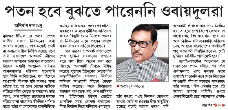 মুহাম্মদ ইউনূস যে ভাবে দেশের জাতীয় সংসদ নির্বাচনের কথা ঘোষণা করেছেন, তার মধ্যেই ভোট না করানোর বীজ নিহিত রয়েছে বলে দাবি বাংলাদেশ আওয়ামী লীগের সাধারণ সম্পাদক ওবায়দুল কাদেরের। নিজের অস্থায়ী আস্তানায় রবিবার আনন্দবাজার পত্রিকার মুখোমুখি হয়ে তিনি জানিয়েছেন, দল হিসেবে আওয়ামী লীগকে যদি কখনও ক্ষমা চাইতে হয়, তা হলে দেশের মাটিতে দাঁড়িয়ে দলীয় নেতৃত্ব তা করবেন। তাঁর আশা, শেখ মুজিবুর রহমানের দলকে দমিয়ে রাখা যাবে না। ‘ফিনিক্স পাখি’র মতো তাঁরা বাংলাদেশের রাজনীতিতে স্বমহিমায় ফিরবেন। তবে শেখ হাসিনা সরকারের আমলে দুর্নীতির অভিযোগ কার্যত কিছুটা মেনে নিলেও গুমঘর বা নির্বাচনের নামে প্রহসন প্রসঙ্গে সরাসরি জবাব এড়িয়ে গিয়েছেন।
