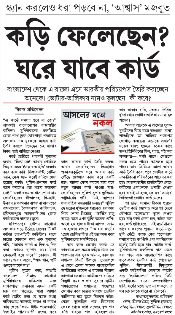 তা ছাড়া, সামান্য টাকায় পুরনো ভোটার কার্ড জোগাড় করে তা থেকে কৌশলে ‘হলোগ্রাম’ তুলে নেওয়া হয়। যাঁর কার্ড কেনা হল, তাঁকে বলা হয়, কার্ড হারিয়েছে—এই মর্মে থানায় ডায়েরি করতে। পুরনো কার্ডে নতুন ছবি সেঁটে, তাতে ফের ‘হলোগ্রাম’ বসানো হয়। তা প্রিন্ট এবং ল্যামিনেশন হলেই তৈরি হয়ে যায় ভোটার কার্ড। মুর্শিদাবাদের জলঙ্গিতে বাস থেকে ধরা পড়া এক বাংলাদেশির কাছে হাতে-গরম ভোটার কার্ড পেয়েছিল পুলিশ। সীমান্তবর্তী বিদুপুরের একটি ফটোকপির দোকানে কার্ডের সদ্য ‘ল্যামিনেশন’ করিয়ে তিনি চেপেছিলেন বাসে। তদন্তকারীদের দাবি, সর্ষের মধ্যে ভূত না থাকলে, এ সব চক্র চলতে পারে না। (চলবে)