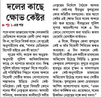 এ দিকে, বীরভূম জেলা তৃণমূলে কেষ্ট ও তাঁর বিরোধী শিবিরের দ্বন্দ্বও অব্যাহত। এ দিন সকালে কেষ্ট-বিরোধী গোষ্ঠীর এক কর্মীকে মারধরের অভিযোগ উঠেছে সিউড়ি ২ ব্লকের কেন্দুয়ার দেশালপুরে। দুপুরে নানুরের হারমুড় গ্রামে দু’জন ও বাসাপাড়ায় এক কেষ্ট-অনুগামীকে মারধরের অভিযোগ উঠেছে দলের অন্য গোষ্ঠীর বিরুদ্ধে। তৃণমূলের জেলা চেয়ারম্যান আশিস বন্দ্যোপাধ্যায় বলেন, “এমন ঘটনা কাঙ্ক্ষিত নয়। প্রয়োজনে, দলের ঊর্ধ্বতন নেতৃত্বের সঙ্গে কথা বলব।”
