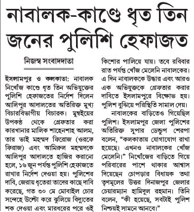 ইসলামপুর ও কলকাতা: নাবালক নিখোঁজ কাণ্ডে ধৃত তিন অভিযুক্তের পুলিশি হেফাজতের নির্দেশ দিলেন আলিপুর আদালতের অতিরিক্ত মুখ্য বিচারবিভাগীয় বিচারক। মুম্বইয়ের উপকণ্ঠ থেকে গ্রেফতার করা কারখানার মালিক শাহেনশাহ আলম, তার ভাই মহম্মদ ফিরোজ (ওরফে ফিরাজ) এবং আমিরুল মহম্মদকে আলিপুর আদালতে হাজির করানো হলে, ১৬ জুন পর্যন্ত পুলিশি হেফাজতে রাখার নির্দেশ দেওয়া হয়। পুলিশের দাবি, জেরায় ধৃতেরা তাদের কাছে দাবি করেছে, গত ৩০ মে মোবাইল চোর সন্দেহে উল্টো করে ঝুলিয়ে বিদ্যুতের শক দেওয়া এবং মারধরের পরে ওই কিশোর পালিয়ে যায়। তবে রবিবার রাত পর্যন্ত খোঁজ মেলেনি নাবালকের। এ দিন নাবালককে উদ্ধার এবং আরও এক অভিযুক্তকে গ্রেফতার করার দাবিতে ইসলামপুরে বিক্ষোভ হয়। পুলিশ বুঝিয়ে পরিস্থিতি সামাল দেয়।