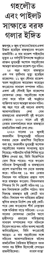 পরে ফের কংগ্রেসের শীর্ষ নেতৃত্বের সঙ্গে ঘনিষ্ঠতা বাড়ে সচিনের। ২০২৪ সালের লোকসভা ভোটের আগে ছত্তীসগঢ়ে প্রচারের দায়িত্বপ্রাপ্ত সাধারণ সম্পাদকের পদে সচিনকে নিয়োগ করে দল। সচিন অবশ্য আগেই জানিয়েছিলেন, তিনি কংগ্রেসেই আছেন। এ বার গহলৌতের সঙ্গে সচিনের আলাপচারিতাকে তাঁদের রাজনৈতিক বৈরিতার ইতিহাসে বরফ গলার বড় ইঙ্গিত হিসেবেই দেখছেন রাজনীতিকেরা। সংবাদ সংস্থা