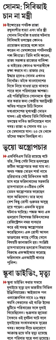 }} ইন্দোরের পর্যটক রাজা রঘুবংশীর হত্যা এবং তাঁর স্ত্রী সোনম নিখোঁজ হওয়ার ঘটনায় সিবিআই তদন্তের কোনও প্রয়োজন রয়েছে বলে মনে করেন না মেঘালয়ের পর্যটনমন্ত্রী পল লিংডো। তিনি দাবি করেন, রাজ্য সরকার রাজ্যের বাসিন্দা ও বাইরের কোনও অপরাধীকে রক্ষা করবে না। রাজার দেহ উদ্ধার হলেও সোনম এখনও নিখোঁজ। তাঁকে বাংলাদেশের দিকে নিয়ে যাওয়া হয়ে থাকতে পারে বলে পরিবারের আশঙ্কা। এই পরিস্থিতিতে সোনমকে খুঁজে বার করার জন্য কেন্দ্রীয় স্বরাষ্ট্রমন্ত্রী অমিত শাহকে চিঠি দিলেন মধ্যপ্রদেশের মুখ্যমন্ত্রী মোহন যাদব। এই ঘটনায় তিনি সিবিআই তদন্তের দাবিও জানিয়েছেন বলে খবর। রাজা ও সোনম গত ২০ মে মেঘালয়ে যান। ২৩ মে থেকে তাঁদের সন্ধান মিলছিল না।