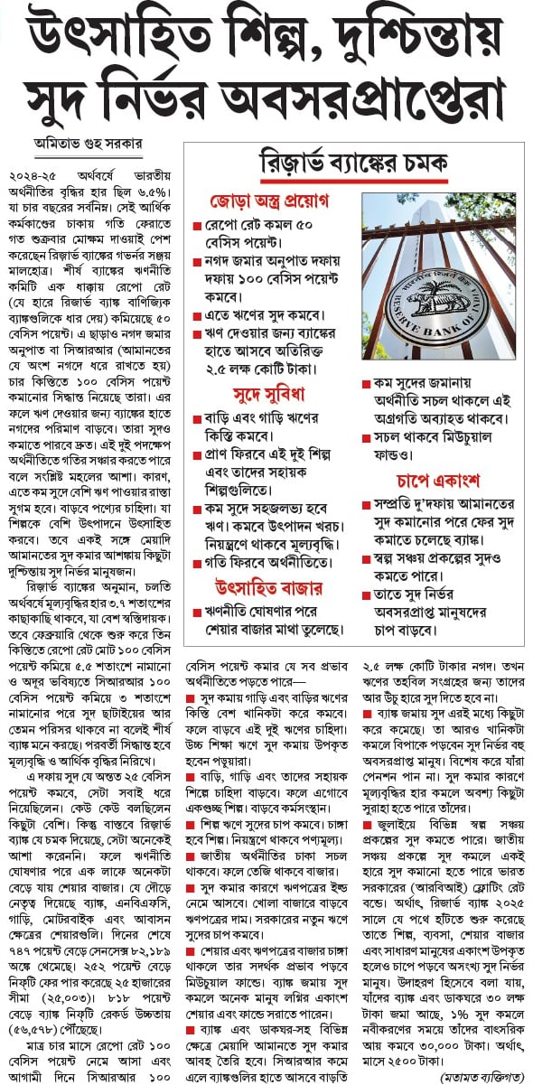 - জুলাইয়ে বিভিন্ন স্বল্প সঞ্চয় প্রকল্পের সুদ কমতে পারে। জাতীয় সঞ্চয় প্রকল্পে সুদ কমলে একই হারে সুদ কমানো হতে পারে ভারত সরকারের (আরবিআই) ফ্লোটিং রেট বন্ডে। অর্থাৎ, রিজার্ভ ব্যাঙ্ক ২০২৫ সালে যে পথে হাঁটতে শুরু করেছে তাতে শিল্প, ব্যবসা, শেয়ার বাজার এবং সাধারণ মানুষের একাংশ উপকৃত হলেও চাপে পড়বে অসংখ্য সুদ নির্ভর মানুষ। উদাহরণ হিসেবে বলা যায়, যাঁদের ব্যাঙ্ক এবং ডাকঘরে ৩০ লক্ষ টাকা জমা আছে, ১% সুদ কমলে নবীকরণের সময়ে তাঁদের বাৎসরিক আয় কমবে ৩০,০০০ টাকা। অর্থাৎ, মাসে ২৫০০ টাকা।