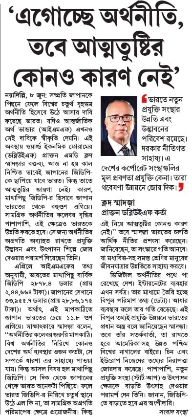 বিশ্ব অর্থনীতির নিরিখে কোনও দেশের অর্থ ব্যবস্থার ওজন কতটা, সে সম্পর্কে ধারণা এর সাহায্যে পাওয়া যায়। কিন্তু আসল বিষয় হল মাথাপিছু জিডিপি। সে দিক থেকে জাপানের থেকে ভারত অনেকটা পিছিয়ে। ফলে ভারত জিডিপি-র নিরিখে চতুর্থ স্থানে উঠে এল কি না, তা সামগ্রিক অগ্রগতি পরিমাপের ক্ষেত্রে প্রয়োজনীয়। কিন্তু এই নিয়ে আত্মতুষ্টির কোনও কারণ নেই।’’ তবে স্মাদজ়া ভারতের চলতি আর্থিক নীতির প্রশংসা করেছেন। জানিয়েছেন, তা সংস্কারে গতি আনবে। যা মধ্যবিত্ত-সহ সমস্ত শ্রেণির মানুষের জীবনযাত্রার উন্নতিতে সাহায্য করবে।