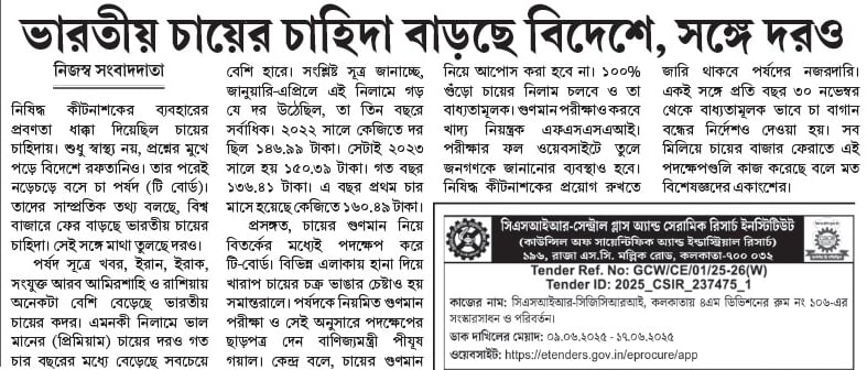 পর্ষদ সূত্রে খবর, ইরান, ইরাক, সংযুক্ত আরব আমিরশাহি ও রাশিয়ায় অনেকটা বেশি বেড়েছে ভারতীয় চায়ের কদর। এমনকী নিলামে ভাল মানের (প্রিমিয়াম) চায়ের দরও গত চার বছরের মধ্যে বেড়েছে সবচেয়ে বেশি হারে। সংশ্লিষ্ট সূত্র জানাচ্ছে, জানুয়ারি-এপ্রিলে এই নিলামে গড় যে দর উঠেছিল, তা তিন বছরে সর্বাধিক। ২০২২ সালে কেজিতে দর ছিল ১৪৬.৯৯ টাকা। সেটাই ২০২৩ সালে হয় ১৫০.৩৯ টাকা। গত বছর ১৩৬.৪১ টাকা। এ বছর প্রথম চার মাসে হয়েছে কেজিতে ১৬০.৪৯ টাকা।