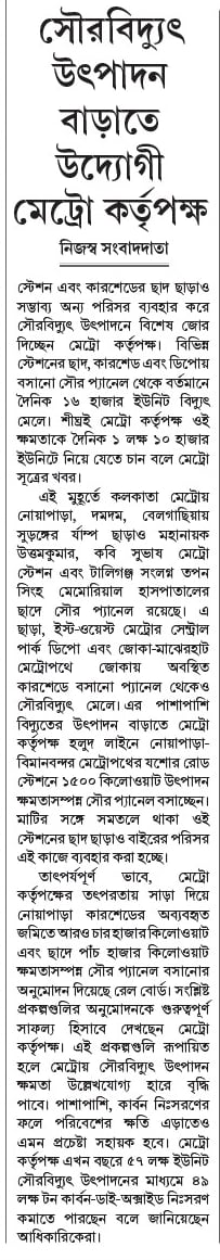 সৌরবিদ্যুৎ উৎপাদন বাড়াতে উদ্যোগী মেট্রো কর্তৃপক্ষ