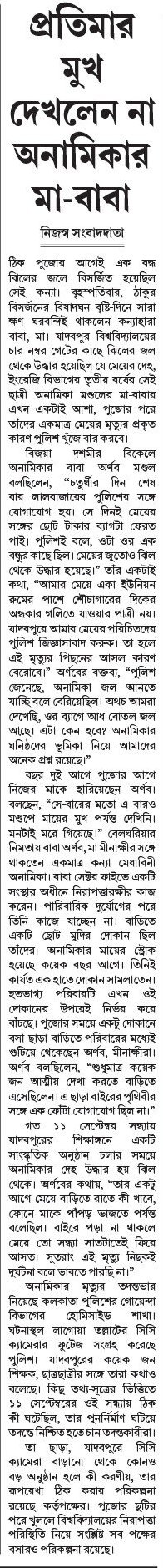 ঠিক পুজোর আগেই এক বদ্ধ ঝিলের জলে বিসর্জিত হয়েছিল সেই কন্যা। বৃহস্পতিবার, ঠাকুর বিসর্জনের বিষাদঘন বৃষ্টি-দিনে সারা ক্ষণ ঘরবন্দিই থাকলেন কন্যাহারা বাবা, মা। যাদবপুর বিশ্ববিদ্যালয়ের চার নম্বর গেটের কাছে ঝিলের জল থেকে উদ্ধার হয়েছিল যে মেয়ের দেহ, ইংরেজি বিভাগের তৃতীয় বর্ষের সেই ছাত্রী অনামিকা মণ্ডলের মা-বাবার এখন একটাই আশা, পুজোর পরে তাঁদের একমাত্র মেয়ের মৃত্যুর প্রকৃত কারণ পুলিশ খুঁজে বার করবে।