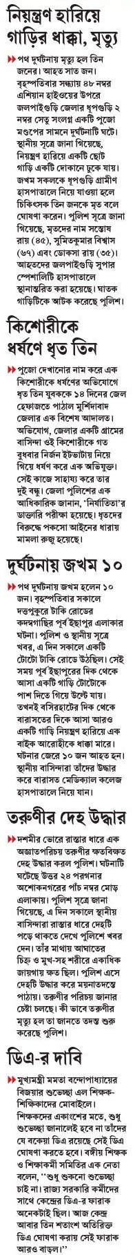 }} পথ দুর্ঘটনায় মৃত্যু হল তিন জনের। আহত সাত জন। বৃহস্পতিবার সন্ধ্যায় ৪৮ নম্বর এশিয়ান হাইওয়ের উপরে জলপাইগুড়ি জেলার ধূপগুড়ি ২ নম্বর সেতু সংলগ্ন একটি পুজো মণ্ডপের সামনে দুর্ঘটনাটি ঘটে। স্থানীয় সূত্রে জানা গিয়েছে, নিয়ন্ত্রণ হারিয়ে একটি ছোট গাড়ি একটি দোকানে ঢুকে যায়। জখম সকলকে ধূপগুড়ি গ্রামীণ হাসপাতালে নিয়ে যাওয়া হলে চিকিৎসক তিন জনকে মৃত বলে ঘোষণা করেন। পুলিশ সূত্রে জানা গিয়েছে, মৃতদের নাম সন্তোষ রায় (৪৫), সুমিতকুমার বিশ্বাস (৬৭) এবং ডোকসা রায় (৩৫)। আহতদের জলপাইগুড়ি সুপার স্পেশালিটি হাসপাতালে স্থানান্তরিত করা হয়েছে। ঘাতক গাড়িটিকে আটক করেছে পুলিশ।