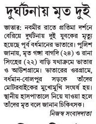 ভাতার: নবমীর রাতে প্রতিমা দর্শনে বেরিয়ে দুর্ঘটনায় দুই যুবকের মৃত্যু হয়েছে পূর্ব বর্ধমানের ভাতারে। পুলিশ জানায়, মৃত গঙ্গা বাগদি (২৪) ও রানা সিংহের (২২) বাড়ি যথাক্রমে ভাতার ও আউশগ্রামে। ভাতারের ওরগ্রামে, বর্ধমান-বোলপুর সড়কে তাঁদের মোটরবাইকের মুখোমুখি সংঘর্ষ হয়। স্থানীয় হাসপাতালে নিয়ে যাওয়া হলে তাঁদের মৃত বলে জানান চিকিৎসক।