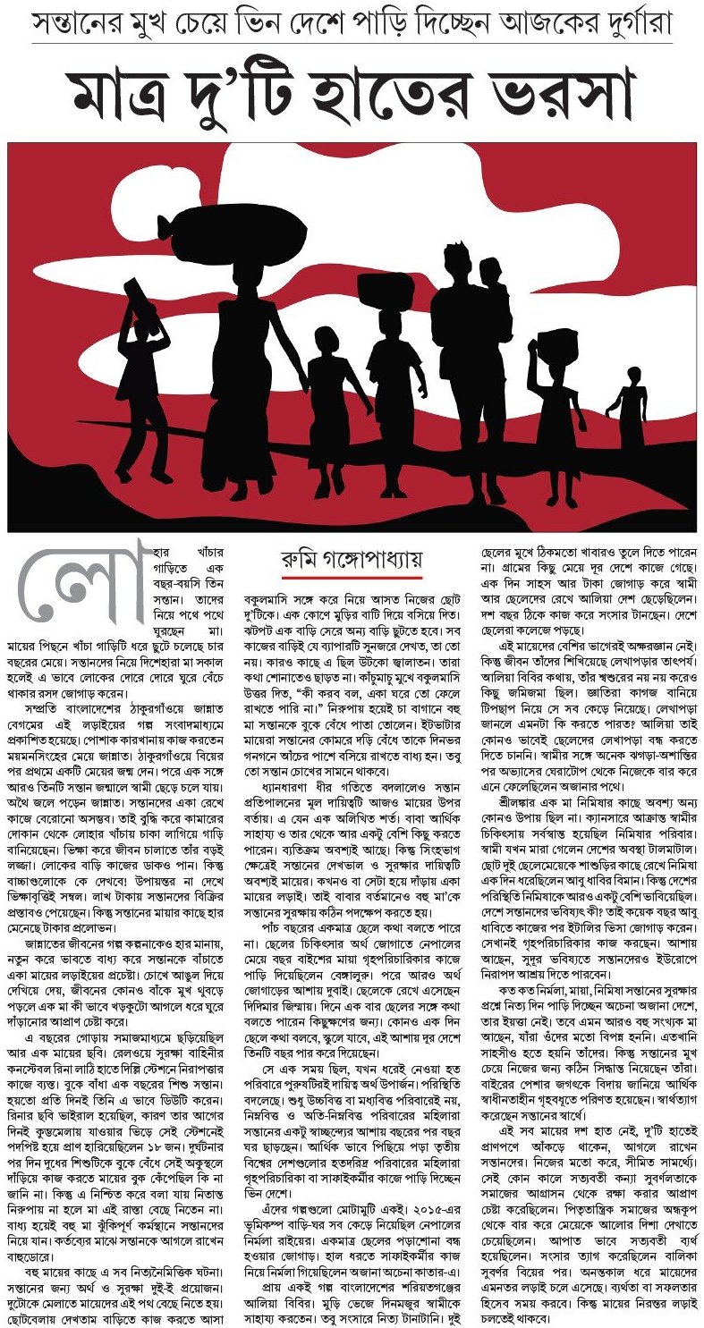 সে এক সময় ছিল, যখন ধরেই নেওয়া হত পরিবারে পুরুষটিরই দায়িত্ব অর্থ উপার্জন। পরিস্থিতি বদলেছে। শুধু উচ্চবিত্ত বা মধ্যবিত্ত পরিবারেই নয়, নিম্নবিত্ত ও অতি-নিম্নবিত্ত পরিবারের মহিলারা সন্তানের একটু স্বাচ্ছন্দ্যের আশায় বছরের পর বছর ঘর ছাড়ছেন। আর্থিক ভাবে পিছিয়ে পড়া তৃতীয় বিশ্বের দেশগুলোর হতদরিদ্র পরিবারের মহিলারা গৃহপরিচারিকা বা সাফাইকর্মীর কাজে পাড়ি দিচ্ছেন ভিন দেশে।