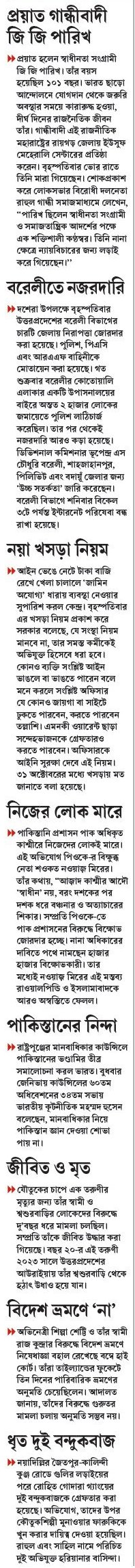 }} প্রয়াত হলেন স্বাধীনতা সংগ্রামী জি জি পারিখ। তাঁর বয়স হয়েছিল ১০১ বছর। ভারত ছাড়ো আন্দোলনে যোগদান থেকে জরুরি অবস্থার সময়ে কারারুদ্ধ হওয়া, দীর্ঘ দিনের রাজনৈতিক জীবন তাঁর। গান্ধীবাদী এই রাজনীতিক মহারাষ্ট্রের রায়গড় জেলায় ইউসুফ মেহেরালি সেন্টারের প্রতিষ্ঠা করেন। বৃহস্পতিবার ভোর রাতে তিনি মারা গিয়েছেন। শোকপ্রকাশ করে লোকসভার বিরোধী দলনেতা রাহুল গান্ধী সমাজমাধ্যমে লেখেন, ‘‘পারিখ ছিলেন স্বাধীনতা সংগ্রামী ও সমাজতান্ত্রিক আদর্শের পক্ষে এক শক্তিশালী কণ্ঠস্বর। তিনি নানা ক্ষেত্রে ন্যায়বিচারের জন্য লড়াই করে গিয়েছেন।’’