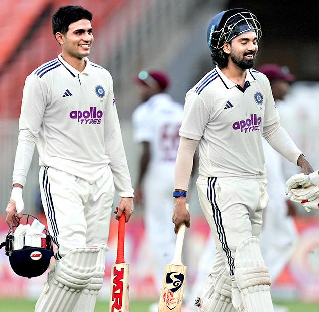 জুটি: আমদাবাদে দিনের শেষে মাঠ ছাড়ছেন গিল-রাহুল। পিটিআই
