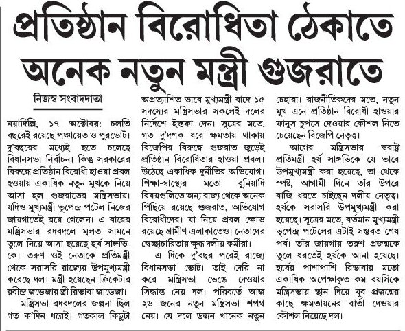 মন্ত্রিসভা রদবদলের জল্পনা ছিল গত ক’দিন ধরেই। গতকাল কিছুটা অপ্রত্যাশিত ভাবে মুখ্যমন্ত্রী বাদে ১৫ সদস্যের মন্ত্রিসভার সকলেই দলের নির্দেশে ইস্তফা দেন। সূত্রের মতে, গত দু’দশক ধরে ক্ষমতায় থাকায় বিজেপির বিরুদ্ধে গুজরাত জুড়েই প্রতিষ্ঠান বিরোধিতার হাওয়া প্রবল। উঠেছে একাধিক দুর্নীতির অভিযোগ। শিক্ষা-স্বাস্থ্যের মতো বুনিয়াদি বিষয়গুলিতে অন্য রাজ্য থেকে অনেক পিছিয়ে রয়েছে গুজরাত, অভিযোগ বিরোধীদের। যা নিয়ে প্রবল ক্ষোভ রয়েছে গ্রামীণ এলাকাতেও। নেতাদের স্বেচ্ছাচারিতায় ক্ষুব্ধ দলীয় কর্মীরা।