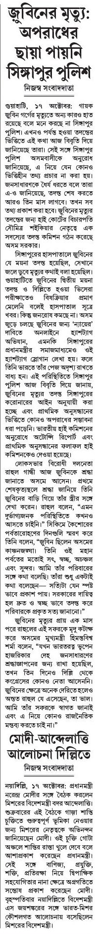 সিঙ্গাপুরের হাসপাতালে জ়ুবিনের যে ময়না তদন্ত হয়েছিল, সেখানে জলে ডুবে মৃত্যুর কথাই বলা হয়েছিল। গুয়াহাটিতে জ়ুবিনের দ্বিতীয় ময়না তদন্ত ও দিল্লিতে হওয়া ভিসেরা পরীক্ষাতেও বিষক্রিয়ার প্রমাণ মেলেনি বলেই হাসপাতাল সূত্রে খবর। কিন্তু জনরোষ কমছে না। অসম জুড়ে চলছে জ়ুবিনের জন্য ‘ন্যায়ের’ দাবিতে অনলাইনে হ্যাশট্যাগ অভিযান, এমনকি সিঙ্গাপুরের প্রধানমন্ত্রীর সমাজমাধ্যমেও ওই হ্যাশট্যাগ স্লোগান লেখা হয়। ফলে তিনি ভারতে তাঁর পেজ অদৃশ্য রাখতে বাধ্য হন। এই পরিস্থিতিতে সিঙ্গাপুর পুলিশ আজ বিবৃতি দিয়ে জানায়, জ়ুবিনের মৃত্যুর তদন্ত সিঙ্গাপুরের করোনারের আইন অনুযায়ী করা হচ্ছে এবং প্রাথমিক অনুসন্ধানের ভিত্তিতে কোনও অপরাধের সম্ভাবনা ধরা পড়েনি। ভারতীয় হাই কমিশনের অনুরোধে অটোপ্সি রিপোর্ট এবং প্রাথমিক অনুসন্ধানের ফলাফল হাই কমিশনকেও দেওয়া হয়েছে।