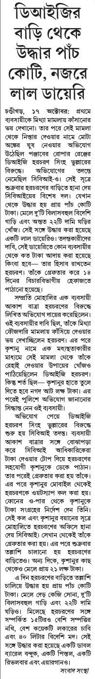 অভিযোগ পেয়ে ডিআইজি হরচরণ সিংহ ভুল্লারের বিরুদ্ধে শুরু হয় সিবিআই তদন্ত। ব্যবসায়ী আকাশ বাত্রার সঙ্গে বোঝাপড়া করে সিবিআই আধিকারিকেরা টাকা দেওয়ার টোপ দিয়ে হরচরণের সহযোগী কৃশানুকে ডেকে পাঠান। তার পরেই গ্রেফতার করা হয় তাঁকে। এর পরে কৃশানুর মোবাইল থেকেই হরচরণকে ওয়টস্যাপ কল করা হয়। ফোনের ও-পার থেকে কৃশানুকে টাকা সংগ্রহের নির্দেশ দেন তিনি। সেই কল এবং কৃশানুর বয়ানের সূত্রে মোহালিতে হরচরণের অফিসে হানা দেয় সিবিআই। সেখান থেকেই তাঁকে গ্রেফতার করা হয়। এর পরে শুক্রবার তল্লাশি চালানো হয় হরচরণের বাড়িতেও। অন্য দিকে, কৃশানুর কাছ থেকেও মেলে প্রায় ২১ লক্ষ টাকা।
