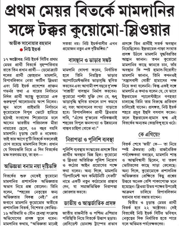 ১৭ অক্টোবর: নিউ ইয়র্ক সিটির প্রথম মেয়র প্রার্থী বিতর্কে বৃহস্পতিবার রাতে তিন প্রধান প্রার্থী— ডেমোক্র্যাট দলের প্রার্থী জ়োহরান মামদানি, রিপাবলিকান নেতা কার্টিস স্লিওয়া এবং নিউ ইয়র্ক প্রদেশের প্রাক্তন গভর্নর তথা এ বারের নির্বাচনে